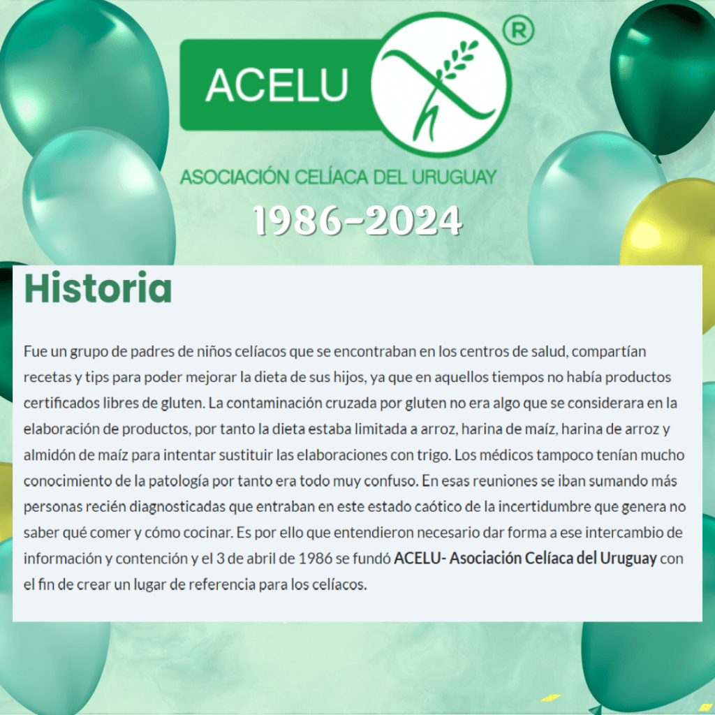 Fue un grupo de padres de niños celíacos que se encontraban en los centros de salud, compartían recetas y tips para poder mejorar la dieta de sus hijos, ya que en aquellos tiempos no había productos certificados libres de gluten. La contaminación cruzada por gluten no era algo que se considerara en la elaboración de productos, por tanto la dieta estaba limitada a arroz, harina de maíz, harina de arroz y almidón de maíz para intentar sustituir las elaboraciones con trigo. Los médicos tampoco tenían mucho conocimiento de la patología por tanto era todo muy confuso. En esas reuniones se iban sumando más personas recién diagnosticadas que entraban en este estado caótico de la incertidumbre que genera no saber qué comer y cómo cocinar. Es por ello que entendieron necesario dar forma a ese intercambio de información y contención y el 3 de abril de 1986 se fundó ACELU- Asociación Celíaca del Uruguay con el fin de crear un lugar de referencia para los celíacos.